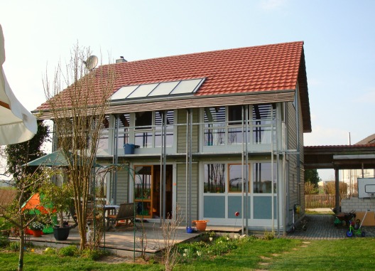 Die Warmwasserbereitung erfolgt über Sonnen- kollektoren, geheizt wird über eine
