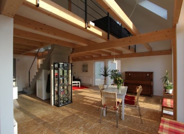 Das Haus wurde in Holzbauweise errichtet, die Bauteiloberflächen beschränken sich auf Holz, OSB und weiß gestrichene Fermacellplatten.