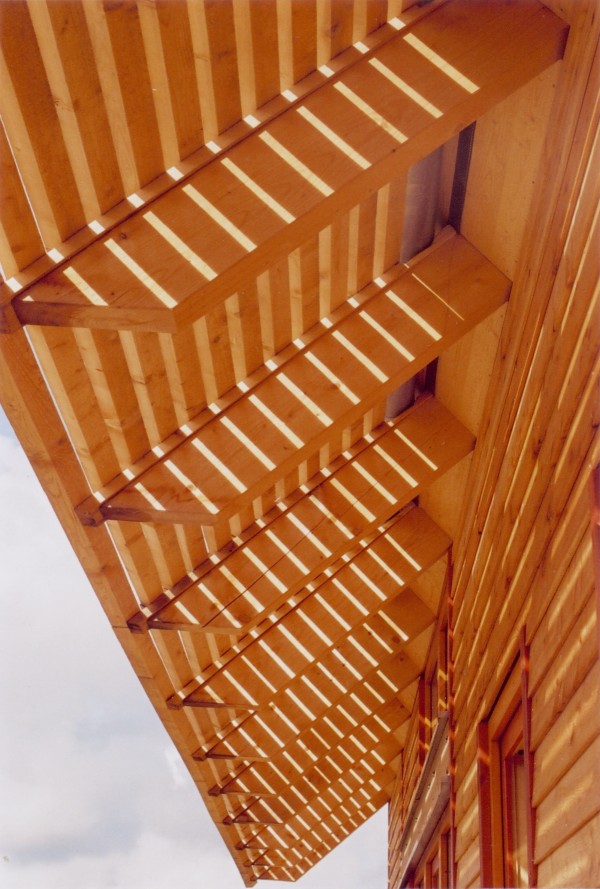 Nach Süden und Westen öffnet eine großzügige Verglasung den allgemeinen Wohnbereich zur Landschaft. Über die Terrasse mit Holzbelag im Süden und Westen wird der Innenraum in den Außenraum fortgesetzt, somit optisch ver- größert. Die Südfenster erhalten ihren sommerlichen Sonnenschutz durch einen Holzrost auf den weit vorgezogenen Sparren. Nach Norden ist das Gebäude fast vollständig geschlossen. Als zusätzliche Puffer dienen hier der Schuppen und das geplante Carport.